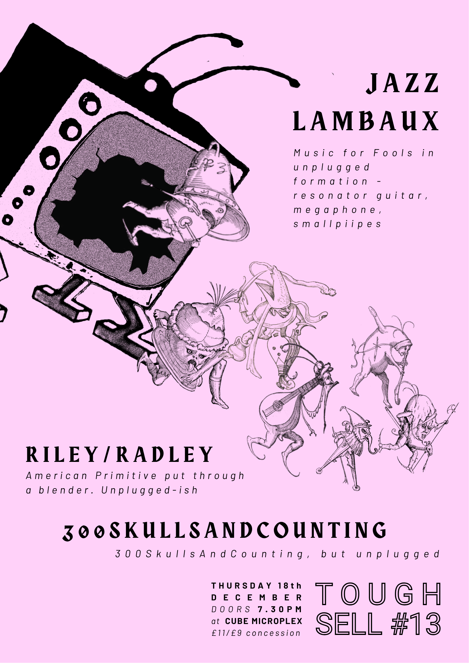 Tough Sell present a night without amplification, as we're joined by troubadour Jazz Lambaux, agent of punk chaos 300SkullsAndCounting, and new Bristol super-group Riley/Radley. Don't expect unplugged to be underwhelming, as these artists push just how hard you can go with a couple of guitars and megaphones (and SMALLPIPES!)