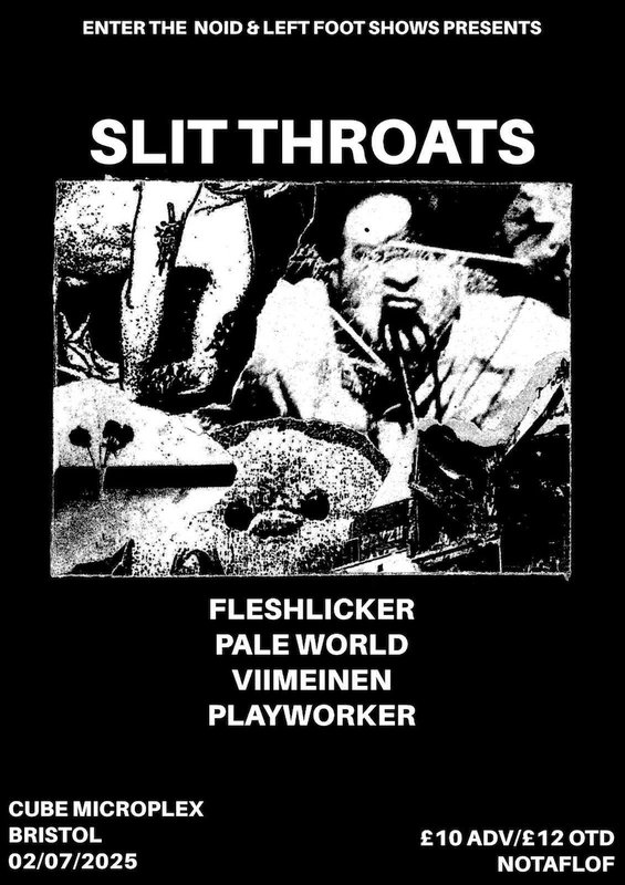 Support comes from Fleshlicker with a rare 2025 performance of their unique brand of body horror static noise alongside the clashing steel from Pale World; considered tape loops and contact mic abuse from Viimeinen and the barrage of hack saw and practice amp destruction of Playworker. All coming to the Cube Microplex for the most stacked Harsh Noise tour package of the summer.